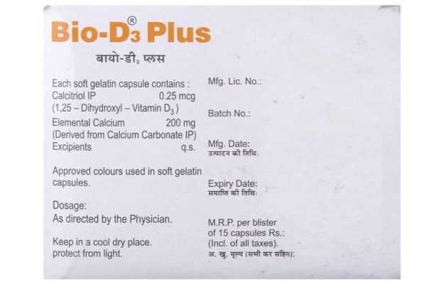 Bio D3 Plus Soft Gelatin Capsule is an allopathic medicine that is primarily used for the treatment of Bone Pain. The key ingredients of Bio D3 Plus Soft Gelatin Capsule are Calcium Carbonate, Alfacalcidol. The correct dosage of Bio D3 Plus Soft Gelatin Capsule depends on the patient's age, gender, and medical history. This information has been provided in detail in the dosage section.