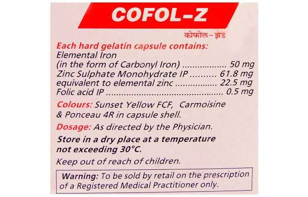 Cofol Z Capsule is an allopathic medicine The key ingredients of Cofol Z Capsule are Iron, Folic Acid, Zinc Sulfate. The correct dosage of Cofol Z Capsule depends on the patient's age, gender, and medical history. This information has been provided in detail in the dosage section.