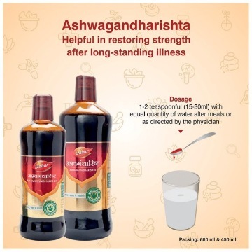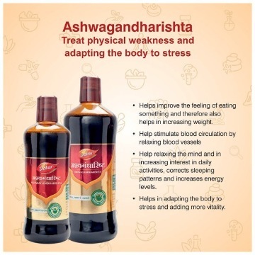Dabur Ashwagandharishta is an ayurvedic medicine that is primarily used for the treatment of Depression, Nerve Weakness. Secondary and off-label uses of Dabur Ashwagandharishta have also been mentioned below. The key ingredients of Dabur Ashwagandharishta are Ashwagandha, Manjishtha, Safed Musli. The properties of which have been shared below. The correct dosage of Dabur Ashwagandharishta depends on the patient's age, gender, and medical history. This information has been provided in detail in the dosage section. ashwagandha tablet for stress