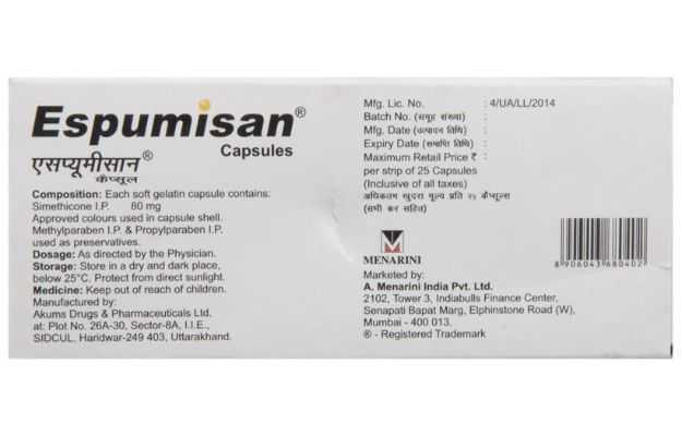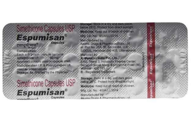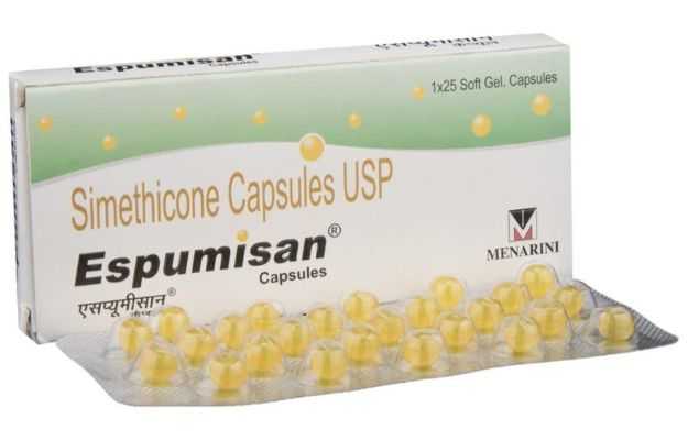 Espumisan, a prescription drug, is manufactured in various forms such as Capsule, Drops, Emulsion. It is typically used for the treatment of Flatulence. Secondary and off-label uses of Espumisan have also been mentioned below.