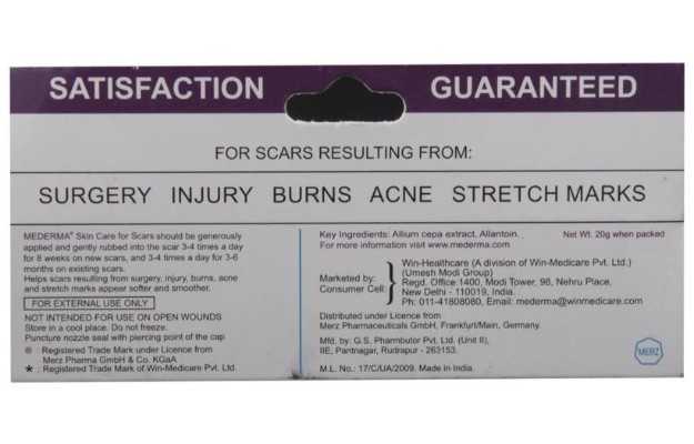 Mederma Scar care gel is an allopathic medicine that is primarily used for the treatment of Scars. The key ingredients of Mederma Scar care gel are Allantoin, Cepalin. The properties of which have been shared below. The correct dosage of Mederma Scar care gel depends on the patient's age, gender, and medical history. This information has been provided in detail in the dosage section.
