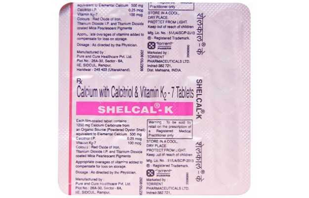 Shelcal K is an allopathic medicine Secondary and off-label uses of Shelcal K have also been mentioned below. The key ingredients of Shelcal K are Calcium, Calcitriol, Vitamin K2. The correct dosage of Shelcal K depends on the patient's age, gender, and medical history. This information has been provided in detail in the dosage section.