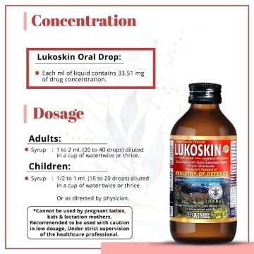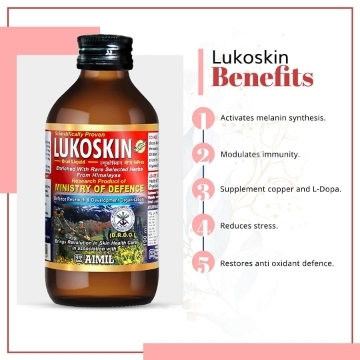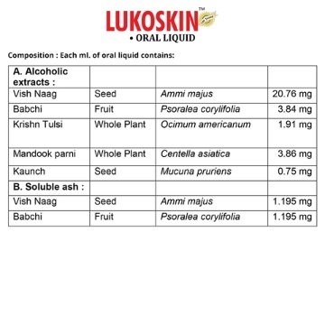 Aimil Lukoskin Oral Liquid बिना डॉक्टर के पर्चे द्वारा मिलने वाली आयुर्वेदिक दवा है, जो मुख्यतः सफेद दाग, मेलेनिन की कमी, इम्यूनिटी बढ़ाना के इलाज के लिए उपयोग किया जाता है। Aimil Lukoskin Oral Liquid के मुख्य घटक हैं कौंच (कपिकच्छु), मंडुकपर्णी, तुलसी, बाकुची जिनकी प्रकृति और गुणों के बारे में नीचे बताया गया है। Aimil Lukoskin Oral Liquid की उचित खुराक मरीज की उम्र, लिंग और उसके स्वास्थ्य संबंधी पिछली समस्याओं पर निर्भर करती है। यह जानकारी विस्तार से खुराक वाले भाग में दी गई है।