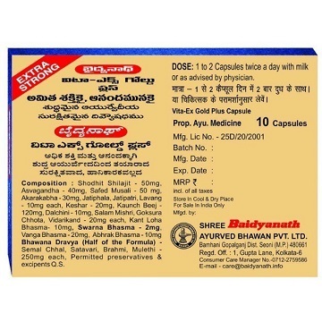 Baidyanath Vita-ex gold plus बिना डॉक्टर के पर्चे द्वारा मिलने वाली आयुर्वेदिक दवा है, जो मुख्यतः बांझपन, यौन शक्ति के इलाज के लिए उपयोग किया जाता है। इसके अलावा Baidyanath Vita-ex gold plus का उपयोग कुछ दूसरी समस्याओं के लिए भी किया जा सकता है। इनके बारे में नीचे विस्तार से जानकारी दी गयी है। Baidyanath Vita-ex gold plus के मुख्य घटक हैं अश्वगंधा, शतावरी, शिलाजीत, स्वर्ण भसमा, सफेद मूसली, रजत भस्म, बंग भस्म (वंग भस्म), अभ्रक भस्म जिनकी प्रकृति और गुणों के बारे में नीचे बताया गया है। Baidyanath Vita-ex gold plus की उचित खुराक मरीज की उम्र, लिंग और उसके स्वास्थ्य संबंधी पिछली समस्याओं पर निर्भर करती है। यह जानकारी विस्तार से खुराक वाले भाग में दी गई है।