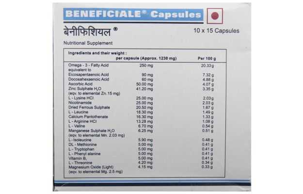 Beneficiale बिना डॉक्टर के पर्चे द्वारा मिलने वाली एलोपैथिक दवा है, Beneficiale के मुख्य घटक हैं एमिनो एसिड , खनिज पदार्थ, विटामिन Beneficiale की उचित खुराक मरीज की उम्र, लिंग और उसके स्वास्थ्य संबंधी पिछली समस्याओं पर निर्भर करती है। यह जानकारी विस्तार से खुराक वाले भाग में दी गई है।