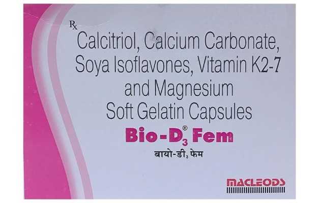 Bio D3 Fem Soft Gelatin Capsule बिना डॉक्टर के पर्चे द्वारा मिलने वाली एलोपैथिक दवा है, जो मुख्यतः पीरियड्स में ज्यादा ब्लीडिंग के इलाज के लिए उपयोग किया जाता है। Bio D3 Fem Soft Gelatin Capsule के मुख्य घटक हैं कैलशियम कारबोनेट, मैग्नीशियम, कैल्सिट्रिओल , विटामिन K2, साय आइसोफ्लेवोन Bio D3 Fem Soft Gelatin Capsule की उचित खुराक मरीज की उम्र, लिंग और उसके स्वास्थ्य संबंधी पिछली समस्याओं पर निर्भर करती है। यह जानकारी विस्तार से खुराक वाले भाग में दी गई है।