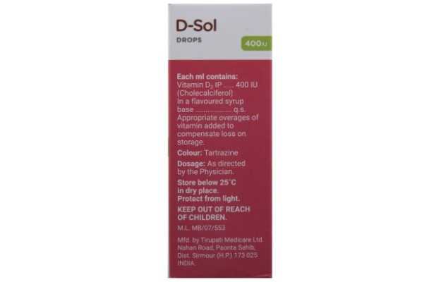 D Sol Drops बिना डॉक्टर के पर्चे द्वारा मिलने वाली एलोपैथिक दवा है, D Sol Drops की उचित खुराक मरीज की उम्र, लिंग और उसके स्वास्थ्य संबंधी पिछली समस्याओं पर निर्भर करती है। यह जानकारी विस्तार से खुराक वाले भाग में दी गई है।