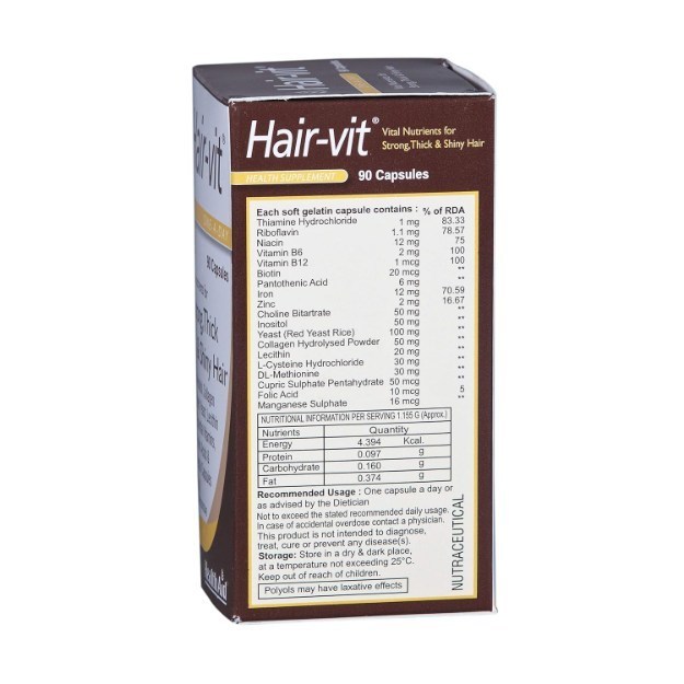 HealthAid Hair-Vit Capsule बिना डॉक्टर के पर्चे द्वारा मिलने वाली एलोपैथिक दवा है, जो मुख्यतः बालों का झड़ना, रूसी, कमजोर इम्यूनिटी के इलाज के लिए उपयोग किया जाता है। HealthAid Hair-Vit Capsule के मुख्य घटक हैं लोह, विटामिन बी कॉम्प्लेक्स, ज़िंक, खनिज पदार्थ, प्रोटीन जिनकी प्रकृति और गुणों के बारे में नीचे बताया गया है। HealthAid Hair-Vit Capsule की उचित खुराक मरीज की उम्र, लिंग और उसके स्वास्थ्य संबंधी पिछली समस्याओं पर निर्भर करती है। यह जानकारी विस्तार से खुराक वाले भाग में दी गई है।