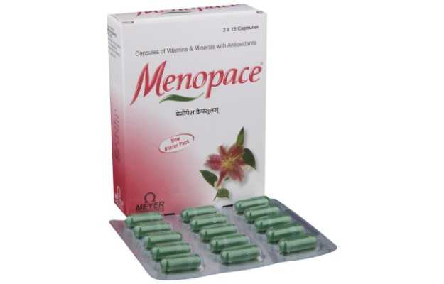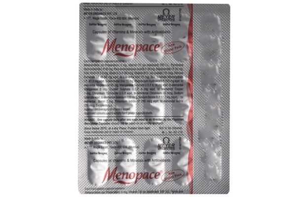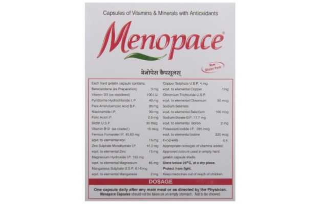 मेनोपैस कैप्सूल विटामिन बी 2 5 मिलीग्राम, विटामिन बी 1 10 मिलीग्राम, मैग्नीशियम 100 मिलीग्राम, विटामिन ए 2500 आईयू, एनियासिनामाइड 20 मिलीग्राम, विटामिन सी 45 मिलीग्राम, जिंक 15 मिलीग्राम, बायोटिन 30 एमसीजी, मैंगनीज 2 मिलीग्राम, क्रोमियम (क्रोमिक) 50 एमसीजी, कॉपर 1 मिलीग्राम, सेलेनियम 100 एमसीजी, विटामिन डी 3 100 आईयू, विटामिन बी 6 40 मिलीग्राम, फोलिक एसिड (विटामिन बी 9) 400 एमसीजी, विटामिन ई 30 मिलीग्राम, आयरन 12 मिलीग्राम, विटामिन बी 12 9 एमसीजी, कैल्शियम पैंटोफेनेट 30 मिलीग्राम, आयोडीन 225 एमसीजी, बोरान 2 मिलीग्राम, और पबा 30 मिलीग्राम मेनोपैस भारत का पहला गैर-एचआरटी (हार्मोन रिप्लेसमेंट थेरेपी) सूत्र है। यह रजोनिवृत्ति के लक्षणों के उपचार के लिए एक चिकित्सीय सिद्ध और चिकित्सा है।