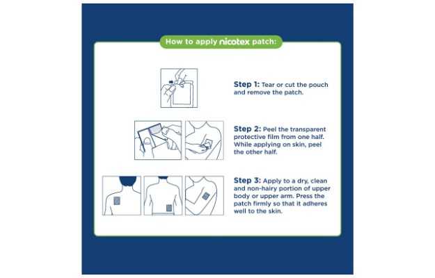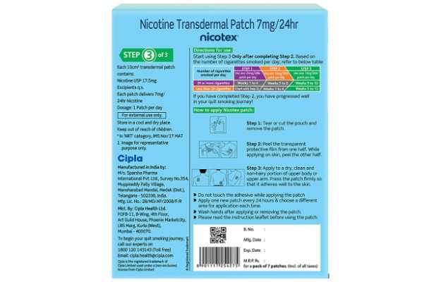 Nicotex Patch बिना डॉक्टर के पर्चे द्वारा मिलने वाली आयुर्वेदिक दवा है, इसके अलावा Nicotex Patch का उपयोग कुछ दूसरी समस्याओं के लिए भी किया जा सकता है। इनके बारे में नीचे विस्तार से जानकारी दी गयी है। Nicotex Patch की उचित खुराक मरीज की उम्र, लिंग और उसके स्वास्थ्य संबंधी पिछली समस्याओं पर निर्भर करती है। यह जानकारी विस्तार से खुराक वाले भाग में दी गई है।