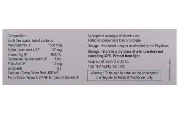 Nurokind D3 Tablet बिना डॉक्टर के पर्चे द्वारा मिलने वाली एलोपैथिक दवा है, इसके अलावा Nurokind D3 Tablet का उपयोग कुछ दूसरी समस्याओं के लिए भी किया जा सकता है। इनके बारे में नीचे विस्तार से जानकारी दी गयी है। Nurokind D3 Tablet के मुख्य घटक हैं फॉलिक एसिड, मिथाइलकोबलामिन , विटामिन डी 3 , विटामिन बी6, अल्फ़ा लिपोइक अम्ल Nurokind D3 Tablet की उचित खुराक मरीज की उम्र, लिंग और उसके स्वास्थ्य संबंधी पिछली समस्याओं पर निर्भर करती है। यह जानकारी विस्तार से खुराक वाले भाग में दी गई है।