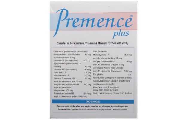 प्रेमिन्स प्लस कैप्सूल मासिक धर्म चक्र से पहले महिलाओं को राहत देने के लिए पूरक है और माहवारी चक्र में ताल को पुनर्स्थापित करता है। इसमें बीटाकोरोटीन, विटामिन और खनिज शामिल हैं जो विटामिन बी 6 के साथ गढ़वाले हैं। संयोजन पीएमएस के कारण विट बी 6, एमजी, जिंक की कमी को सही करके पीएमएस के मूल कारण पर काम करता है। बीटा कैरोटीन समृद्ध कैप्सूल सामान्य हार्मोनल संतुलन बनाए रखने में और मासिक धर्म चक्र के दौरान पोषण को सुरक्षित रखने में मदद करता है। यह आपको स्वस्थ बना देता है, और अनियमित अवधियों का इलाज करने में मदद करता है, डिस्मेनेरोहायआ और स्तन कोमलता