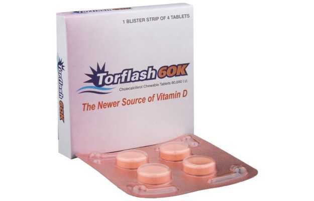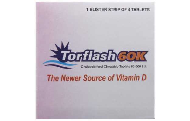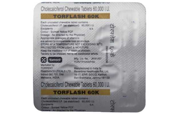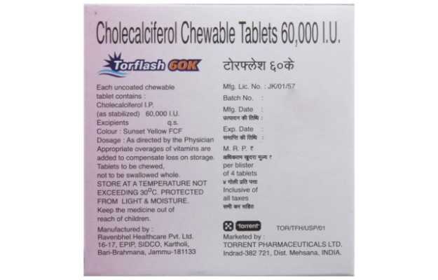 Torflash में Cholecalciferol 60,000 iu (अंतर्राष्ट्रीय इकाइयों) शामिल हैं चॉलेकलिफेरोल (विटामिन डी 3) जो कि वसा में घुलनशील विटामिन है, जो शरीर को कैल्शियम और फास्फोरस को भोजन और पूरक आहार में अवशोषित करने में मदद करता है। विटामिन डी शरीर द्वारा बनाया जाता है जब त्वचा को सूर्य के प्रकाश से उजागर किया जाता है सनस्क्रीन, सुरक्षात्मक कपड़ों, सूरज की रोशनी, अंधेरे त्वचा, और उम्र के लिए सीमित जोखिम सूर्य से पर्याप्त विटामिन डी होने से रोका जा सकता है, जिससे विटामिन डी 3 की कमी हो सकती है। इस प्रकार, शरीर में कैल्शियम अवशोषण के लिए टॉरफैस टैबलेट में विटामिन डी 3 आवश्यक है